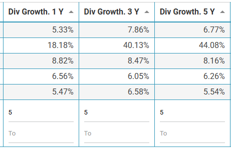 | Dividend Growth in the last five years in percentage. Same as above, great for trending as it shows how constant the dividend increases are or not. It also gives you insight if that percentage has been decreasing or increasing as the years passed. |