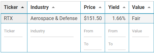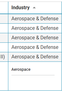 | On the Industry Column type the one you’re interested in. We’ll use Aerospace & Defense. | ![]() The List will show all Stocks under that Industry. |