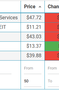 | On the Price Column go the bottom and put your information. We’ll say we want a stock not more than $50 current share price. Type 50 on To space. | ![]() The List will update to show stocks that cost less than $50. |