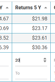 | While we are looking for mostly dividends we do want a stock that has some good price appreciation the last few years. On Returns 5 Y column add leave Top blank and add 20 to From. | ![]() The List will update to show all stocks with $20 or more returns in the past 5 years. |